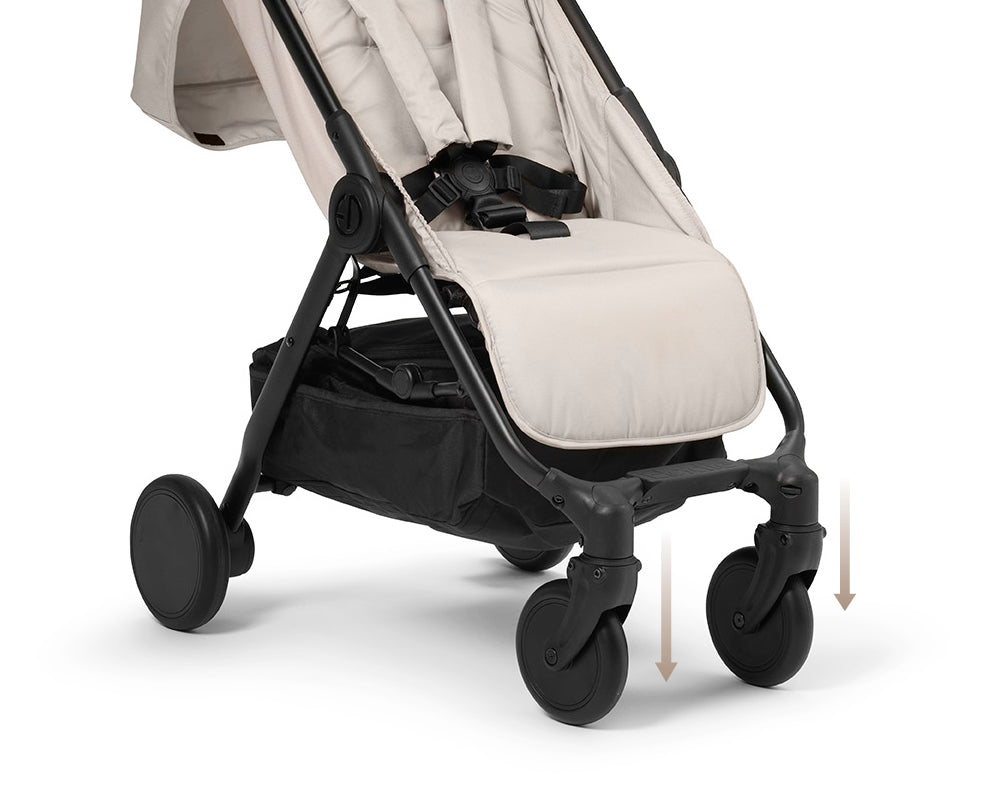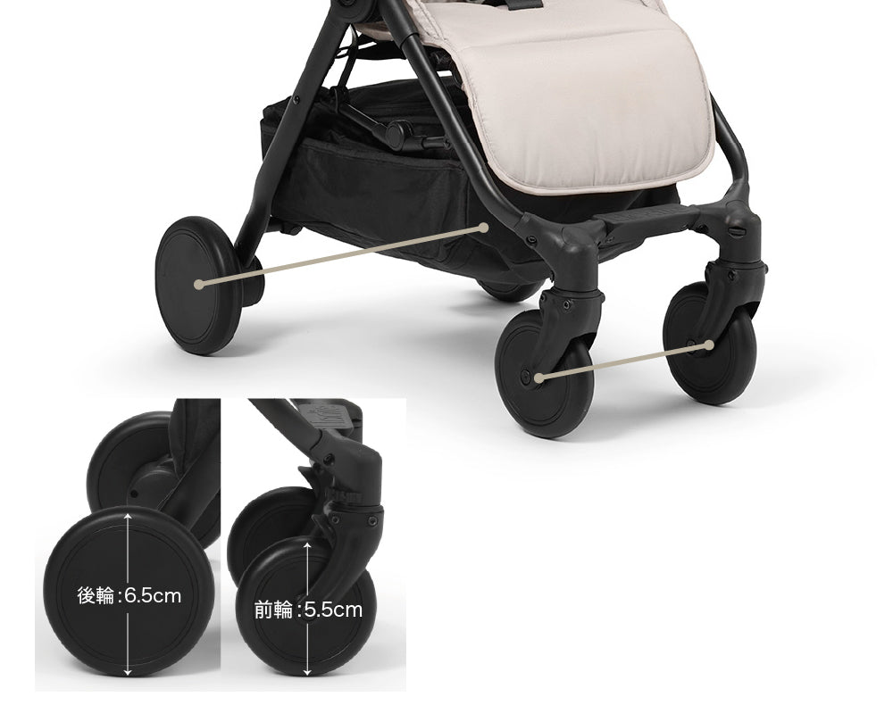 ・前輪部分には衝撃を吸収するサスペンションが内蔵されており、走行中に赤ちゃんに伝わる振動を和らげ、段差を上がる際もスムーズです。