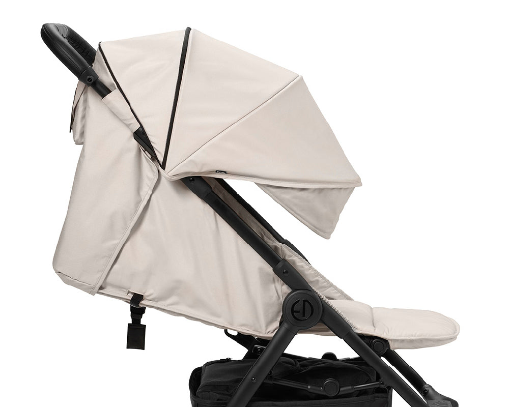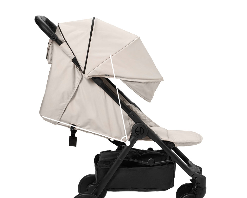 最もリクライニングした状態で新生児から使用可能。UPF50+のキャノピーが紫外線や風を防ぎ、軽量なのに頑丈なフレームと衝撃吸収ホイールで、スムーズで快適な乗り心地。