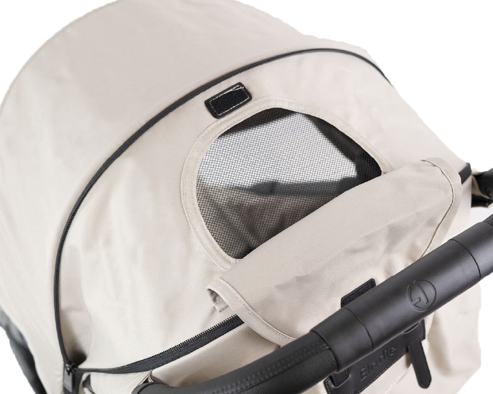 ジッパーを開けると大きく開く、折りたたみ式キャノピーは、UPF50+の紫外線カット機能付き、突然の雨にも対応する撥水仕様。