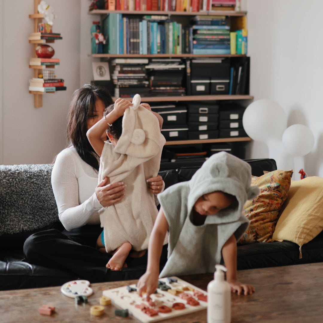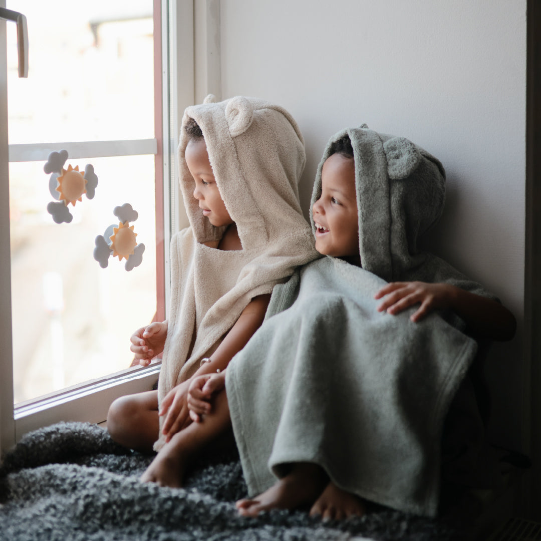 吸水性も抜群で、動きやすいポンチョ型だから、元気に動き回るお子さまにもぴったりです。落ち着いた色合いで、シンプルなデザインが好きな方に。