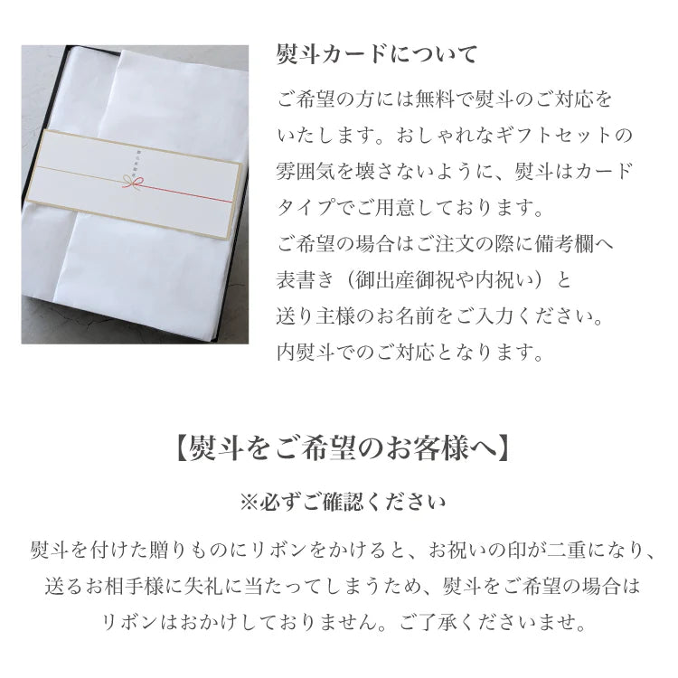 ご希望のお客様にお付けいたします。ご注文の際にご希望の種類(御出産祝や内祝いなど)と、お名前(贈り主様)を備考欄にご記入ください。