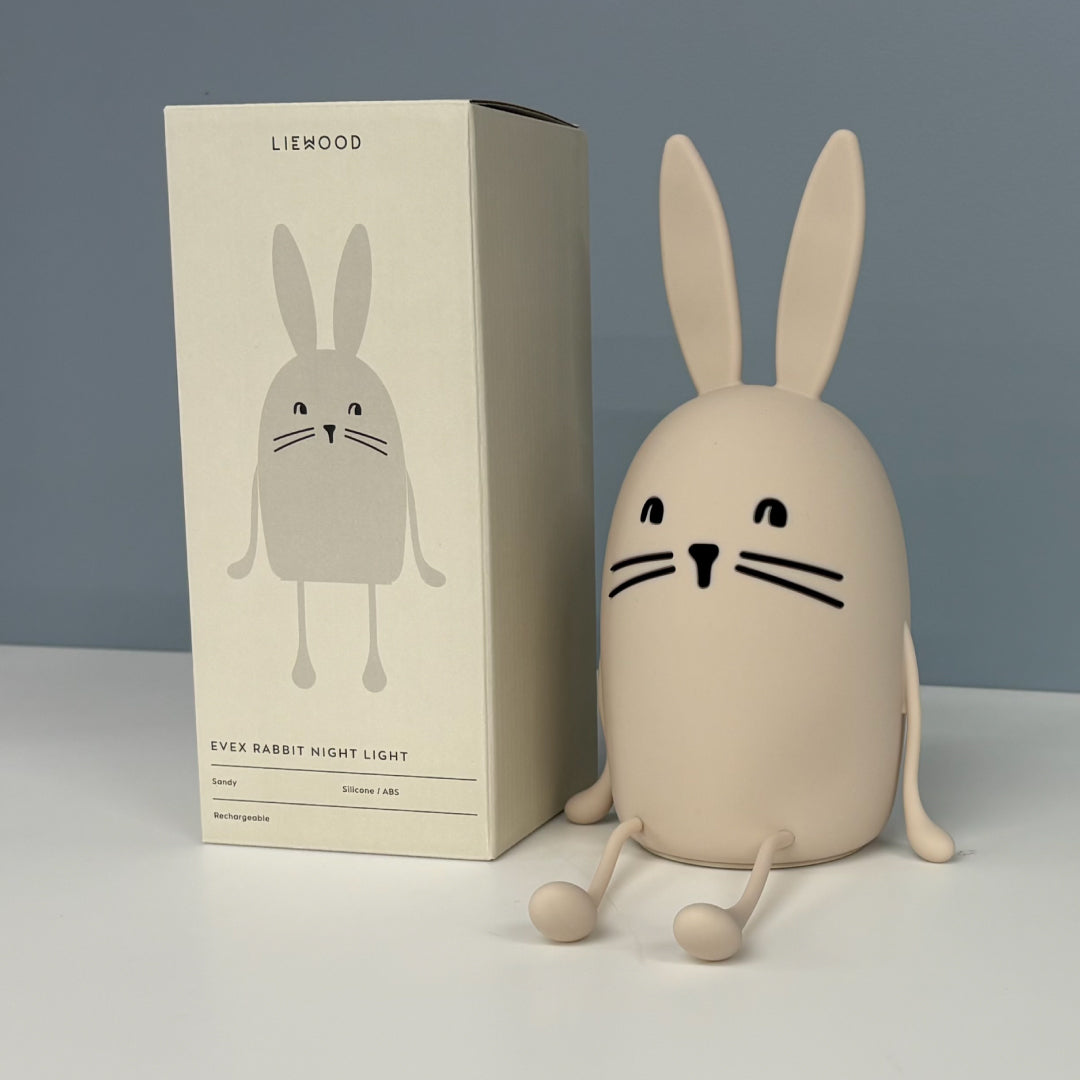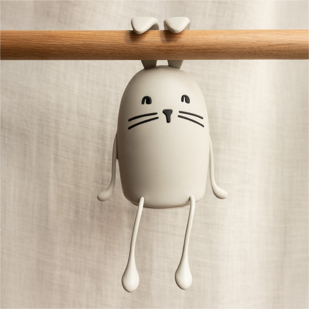 かわいいウサギのデザインが魅力のナイトライト。やさしい光でお子さまを安心させ、心地よい眠りに導きます。コンパクトで持ち運びも便利。形を変えられる耳でオープン棚やバーに吊るすことができます。