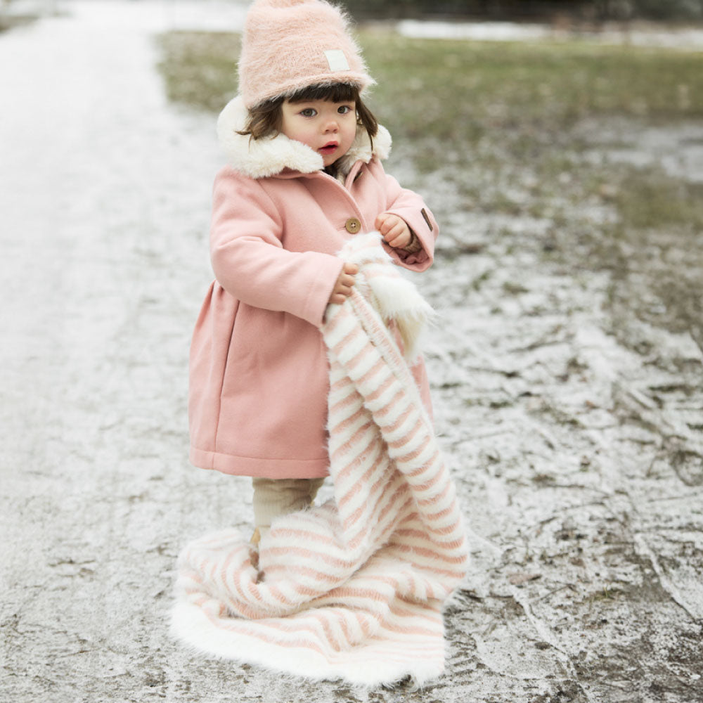肌触りのよいファーをあしらったブランケットは、赤ちゃんの小さな体をやさしく包み込むのにぴったりのサイズ。