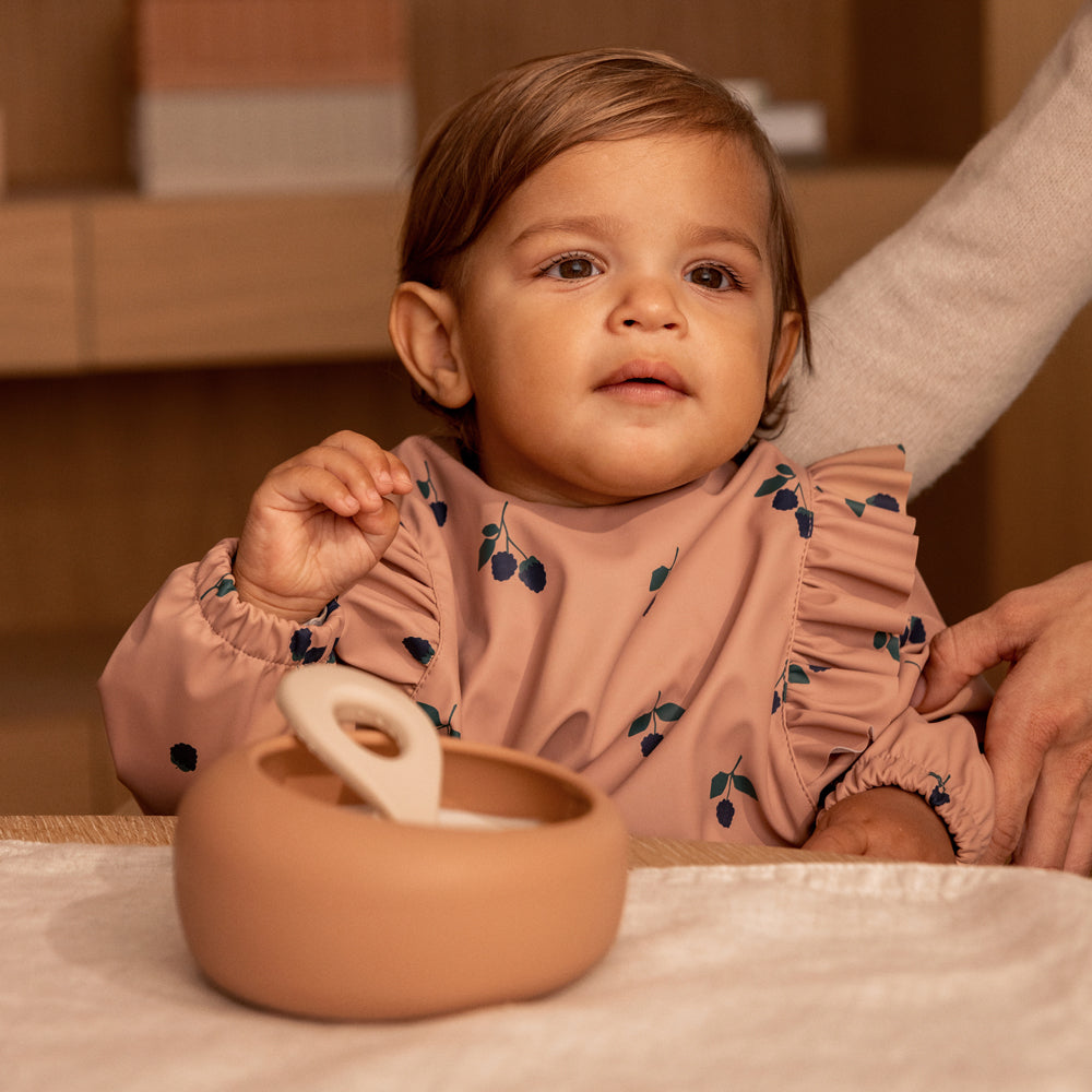 自分で食事を食べ始めたお子様にぴったりの長袖お食事エプロン。