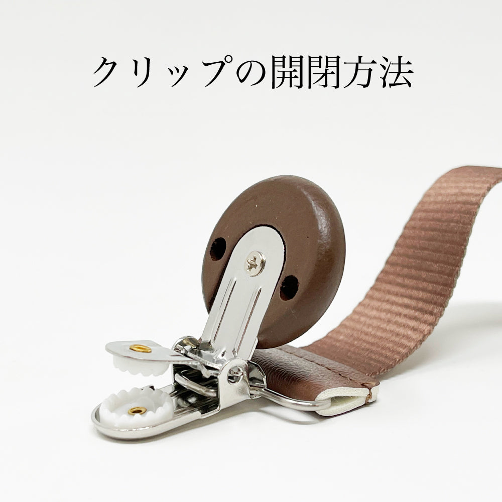 クリップをお子さまの服に、シリコンリングをおしゃぶりに装着します。