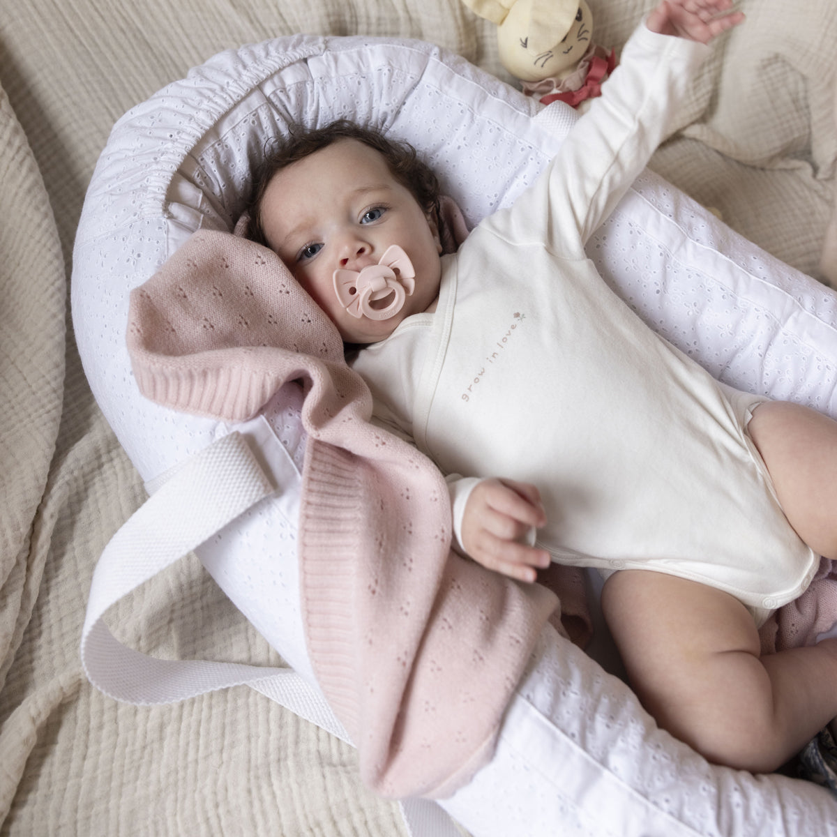 ポインテルブランケットは、愛らしいレースの模様とカシミアのような手触りが特徴です。赤ちゃんにぴったりのサイズ感でベビーカーやベビーベッドで使える、あたたかくてやわらかな素材でいつでも心地よく包み込んでくるので快適です。洗濯も簡単で、何度も洗っても品質を損ないません。お家でもお出かけ先でもどこでも使えて赤ちゃんの敏感なお肌にも優しい肌触りです。