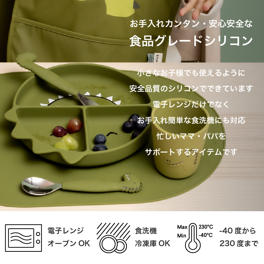 100%シリコン製でやわらかい手触り&落としても割れにくい安心設計。電子レンジ、オーブン、冷凍庫、食洗機にも対応しているので、お手入れも簡単で使いやすいプレートです!