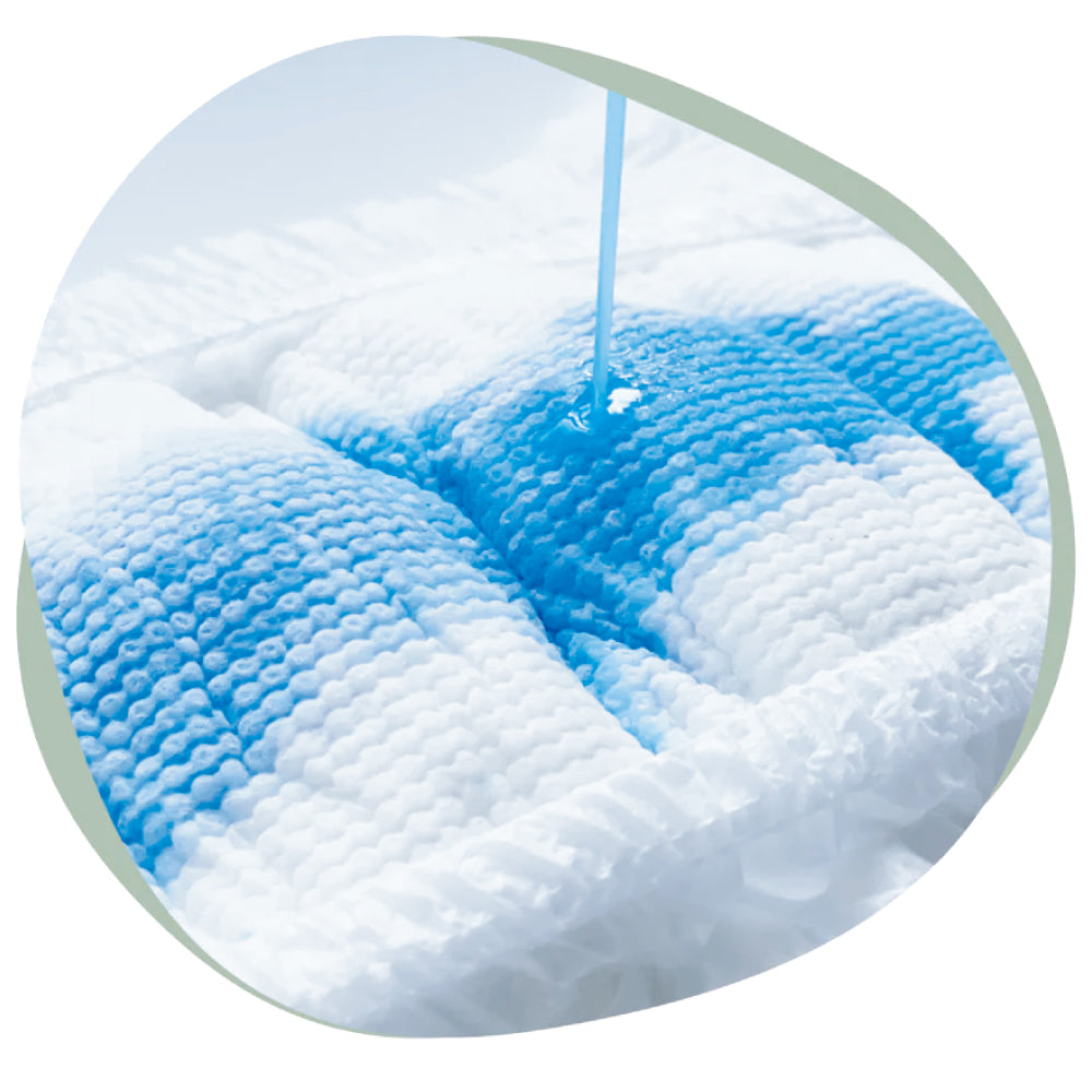 こだわりの吸水パッド(特許取得の360°吸水パッド)が吸収面を広げるので、水分を瞬時に吸収!だからお肌に触れるおむつ部分はいつでもさらさら。