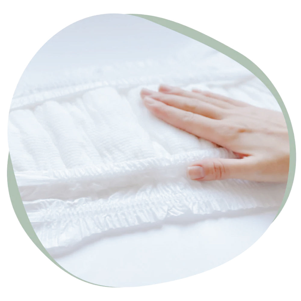 おむつの外側のシートは通気性、速乾性にすぐれている竹繊維を採用。湿気を逃すので最大12時間*さらさら状態で快適。竹繊維にも化学薬品を一切使用していないので赤ちゃんにやさしい。*赤ちゃんのおしっこの量には個人差があります。